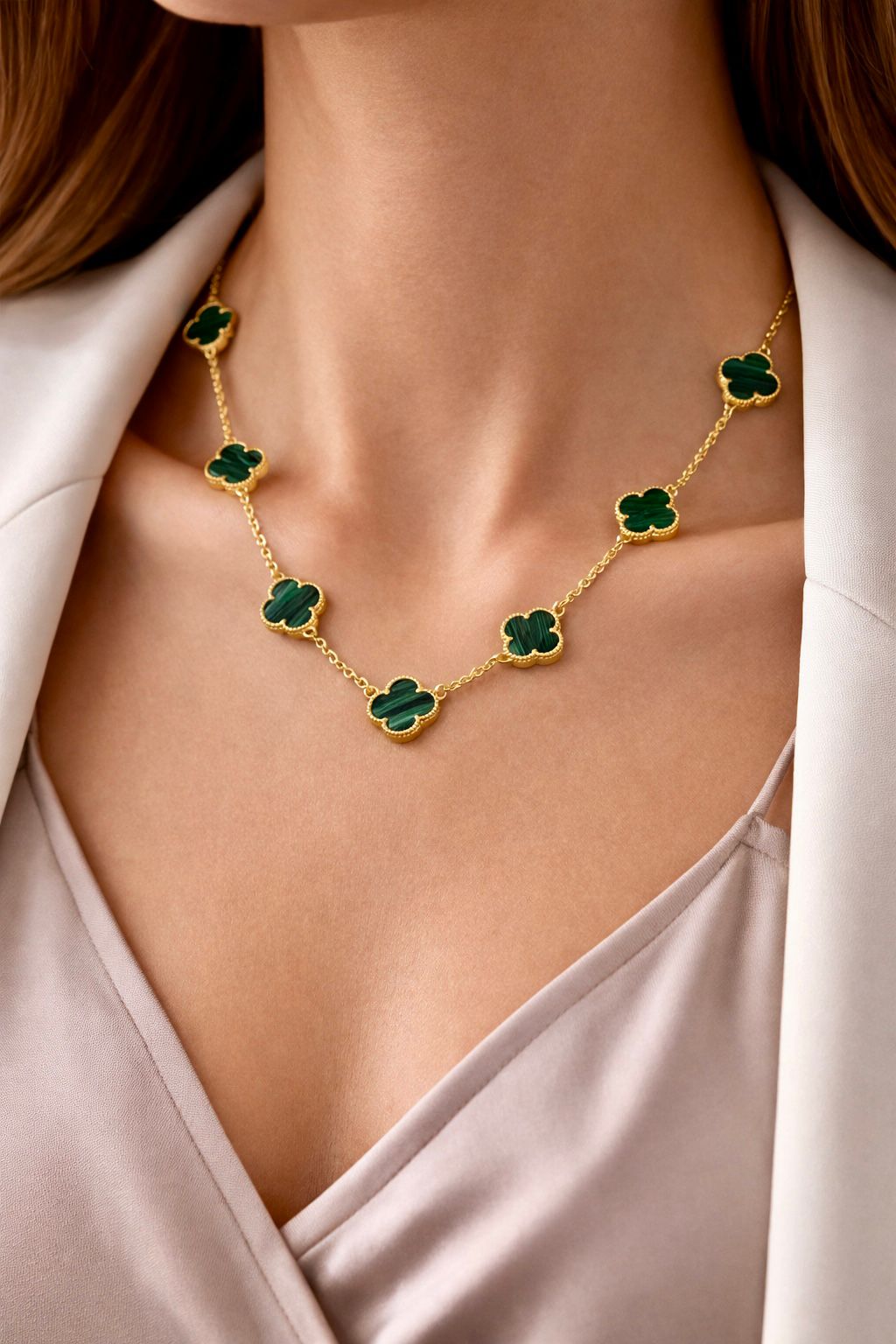 Zarif yeşil yonca detayları ve altın renk zincir tasarımı ile şıklığı ön plana çıkaran bu özel kolye, modern ve klasik tarzı bir araya getirir. Şansın sembolü olan yonca formu ile hem anlamlı hem de estetik bir aksesuar sunar.
