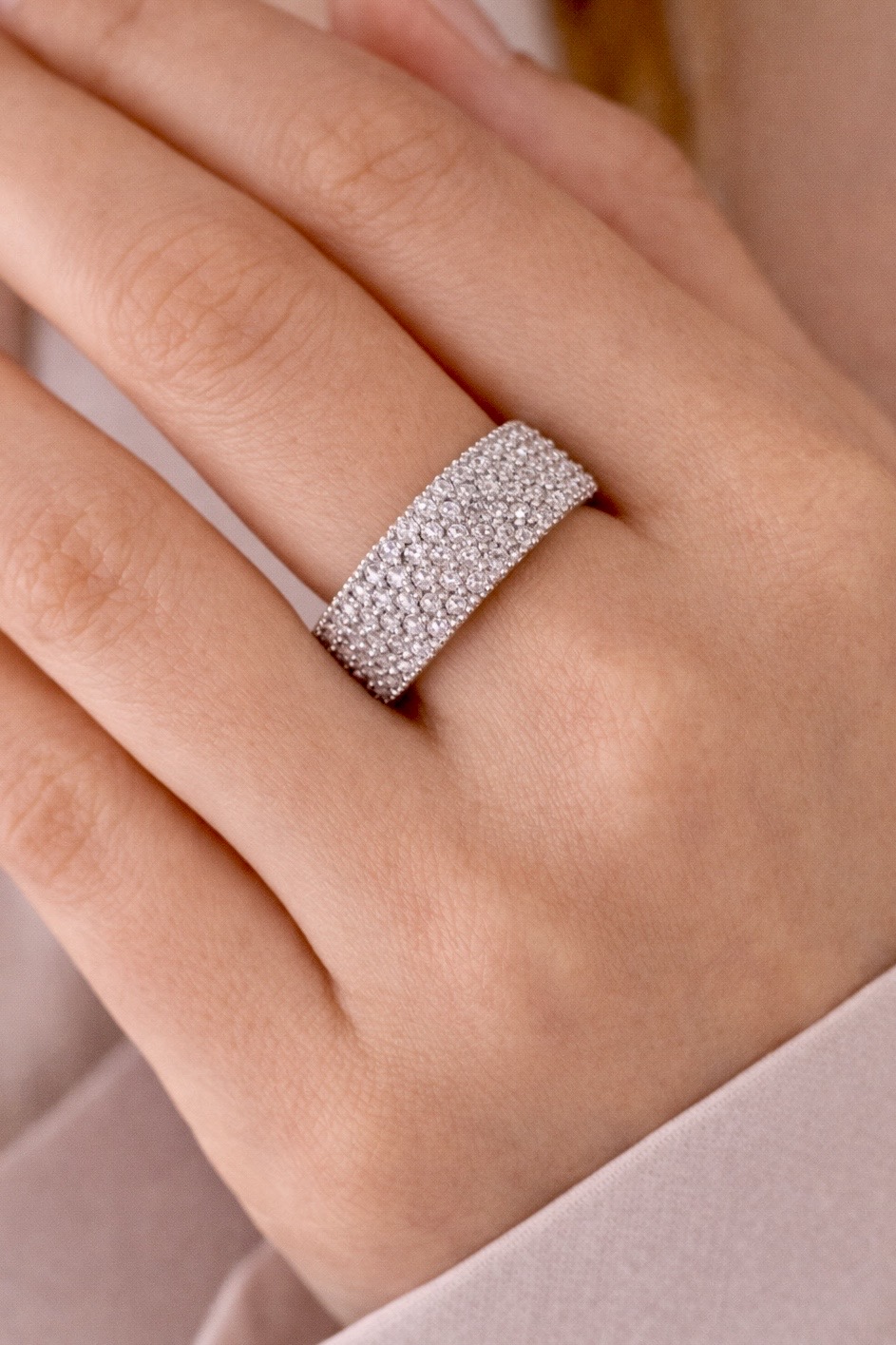 Geniş ve dolgun formu sayesinde parmakta kendini gösteren bu model, özel davetler ve şık kombinler için ideal bir tamamlayıcıdır. Işığı mükemmel yansıtan taş yapısı sayesinde pırlanta etkisi yaratır ve stilinize üst düzey bir dokunuş katar.
