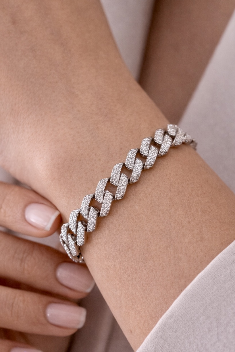 Modern ve iddialı tasarımıyla öne çıkan Zirkon Taşlı Lüks Zincir Bileklik, yoğun taş işçiliği ve dolgun yapısıyla premium bir duruş sunar. Parlak zirkon taşlarla kaplı zincir formu, bileğinizde dikkat çekici bir ışıltı oluşturur.